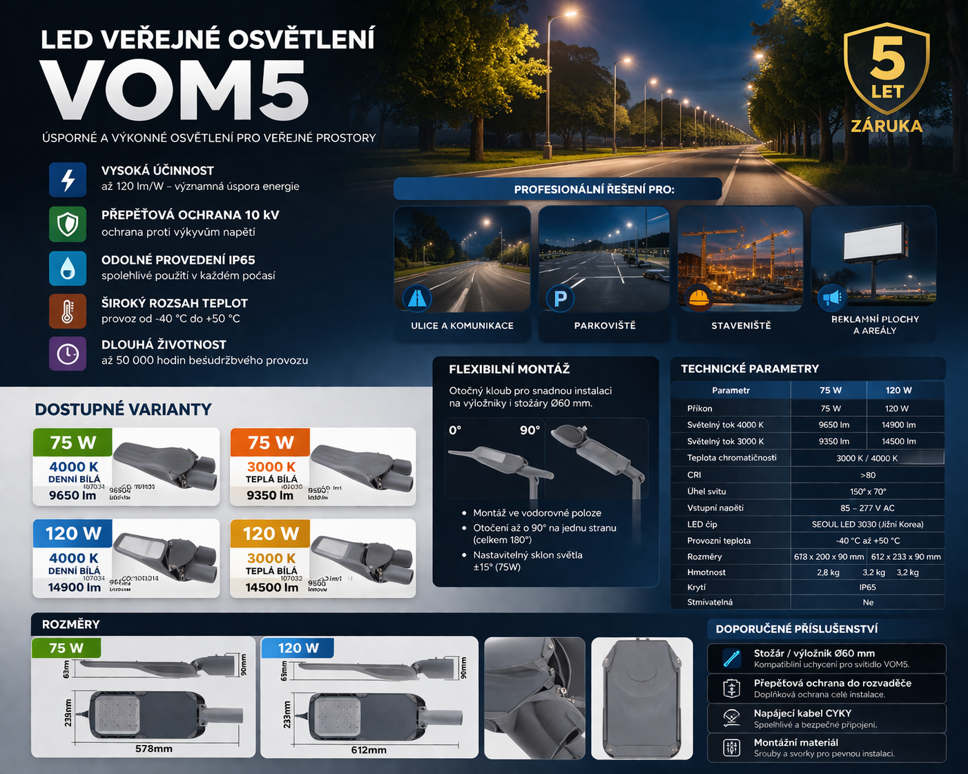 Řada VOM5 byla navržena jako komplexní řešení pro veřejné a průmyslové osvětlení. Kombinuje vysoký světelný výkon s dlouhou životností a minimálními provozními náklady.