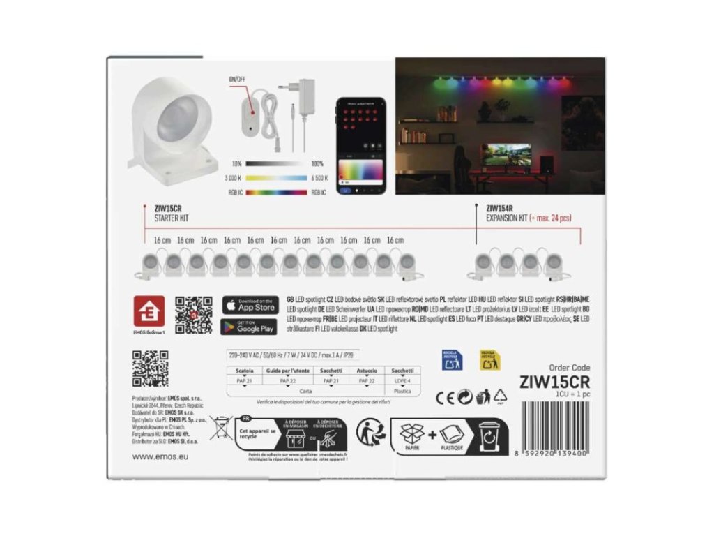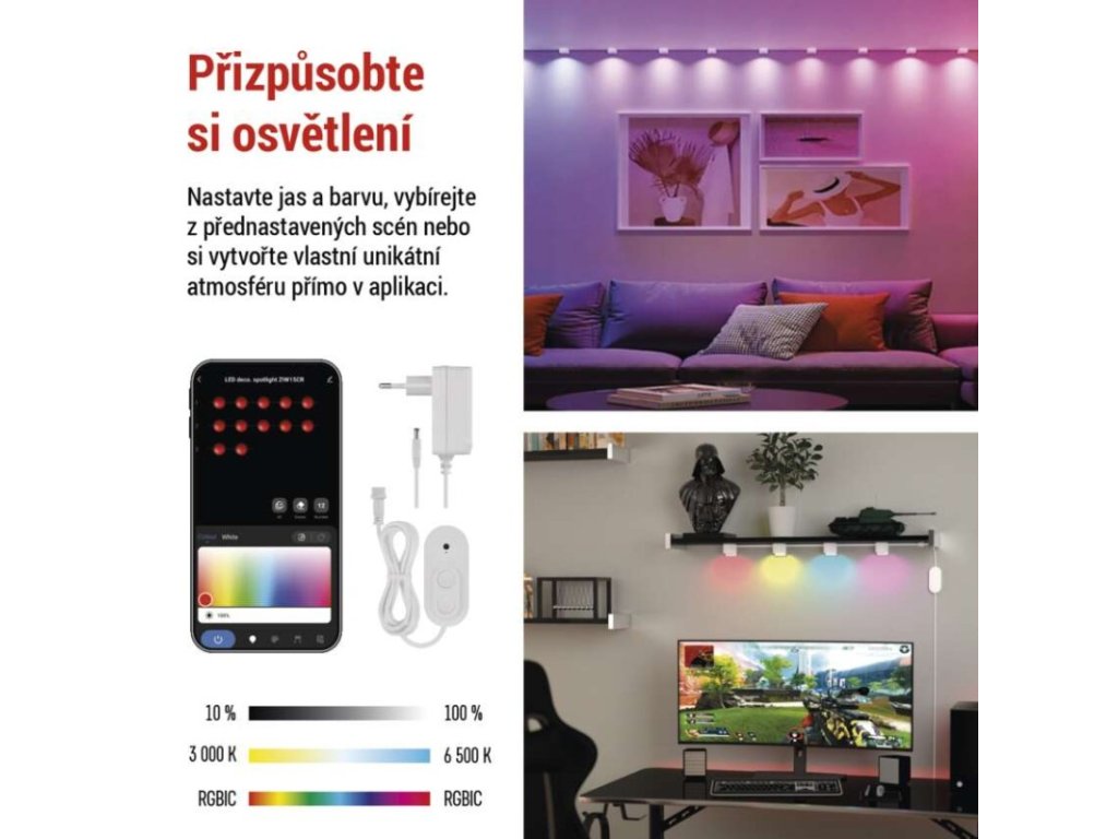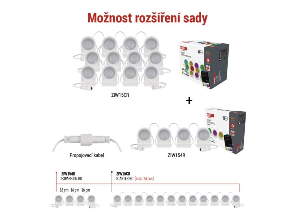 Startovací sada (ZIW15CR) obsahuje 12 chytrých bodových světel, se kterými okamžitě navodíte světelnou atmosféru v každé místnosti. A pokud potřebujete víc světla – žádný problém. Díky rozšiřující sadě (ZIW154R) po 4 kusech můžete celkový počet světel navýšit až na 24. Ideální řešení pro osvětlení celého pokoje, otevřeného obýváku nebo většího prostoru.