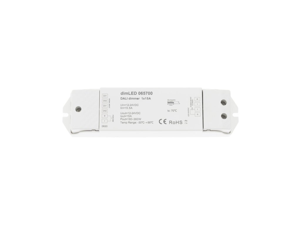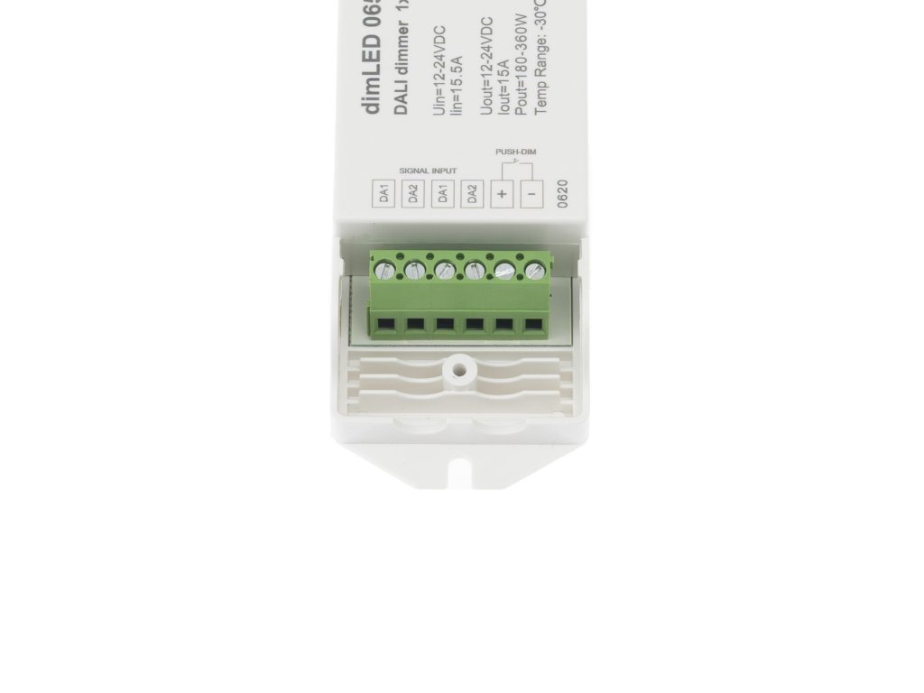 dimLED DALI stmívač 1×15 A slouží jako DALI převodník pro PWM stmívání LED komponent, které nejsou přímo kompatibilní s DALI řízením. Umožňuje tak začlenit LED pásky a LED moduly 12–24 V DC do profesionálních DALI systémů řízení osvětlení.