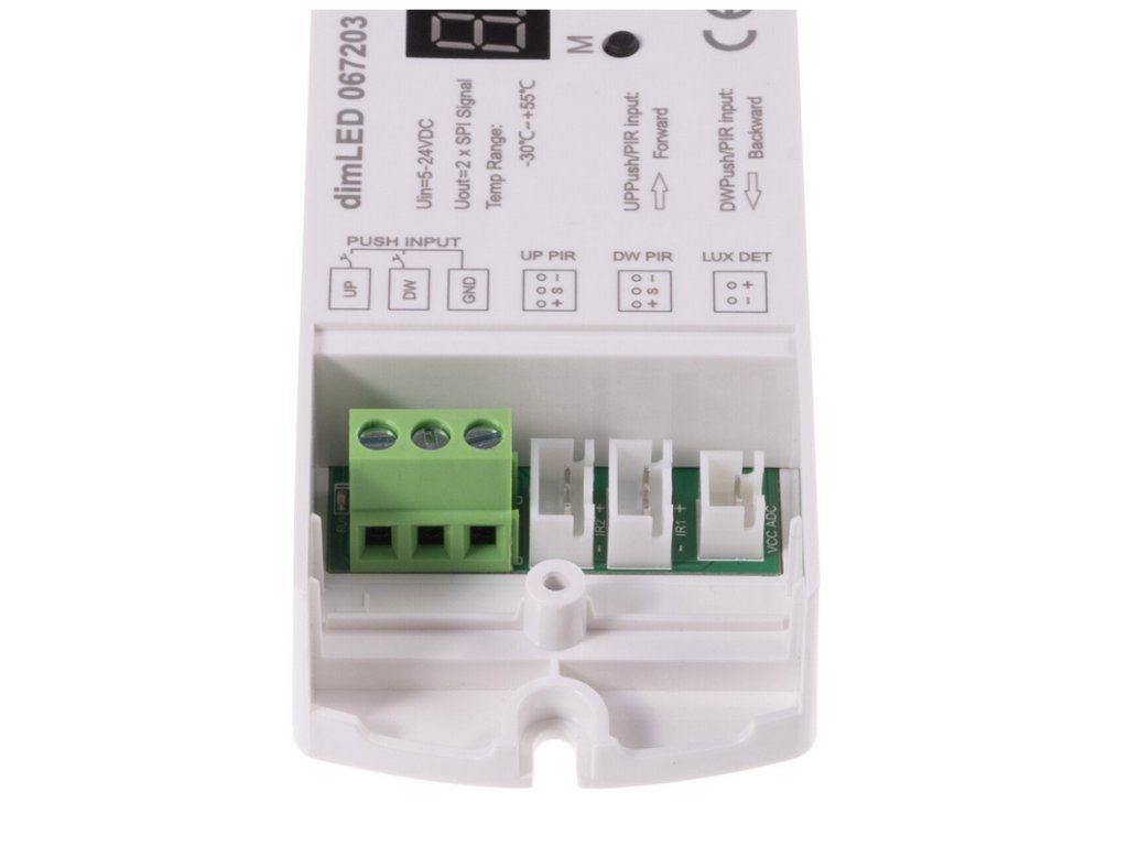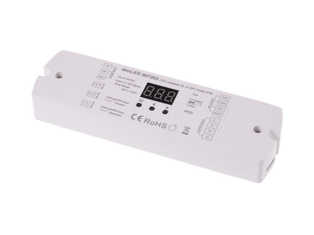 Profesionální digitální SPI ovladač dimLED SL-D SPI umožňuje řízení jednobarevných i RGB adresovatelných LED pásků pomocí pohybových senzorů, světelného čidla nebo tlačítek.