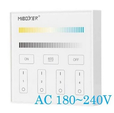 Bezdrártový nástěnný ovladač/vypínač Mi-Light T1 s napájením 180-240V, pro jednobarevné a CCT LED pásky a osvětlení, je vybaven pro ovládání čtyř samostatných okruhů či zón osvětlení. Při spojení s přijímači ML5 lze u osvětlení plynule regulovat jas (DIM stmívat) a samozřejně i všechny okruhy zapnout a vypnout. Ovladač je vybaven dotykovým tlačítkem "DELAY OFF", což spustí funkci opožděného vypnutí se zpožděním 60sekund. Ovladač by měl být umístěn do 30metrů od přijímačů, ale při použití více přijímačů po různé zóny, se vzdálenost prodlužuje o rádius třiceti metrů kolem každého přijímače. Všechny prvky jsou spolu schopny aktivně komunikovat a předávat si ovládací signál a tím se zásadně zvětší pokrytí v rámci celého domu nebo objektu.