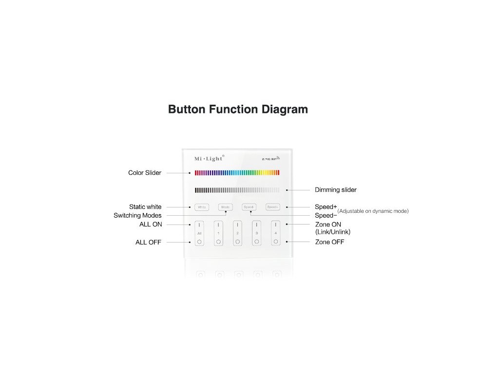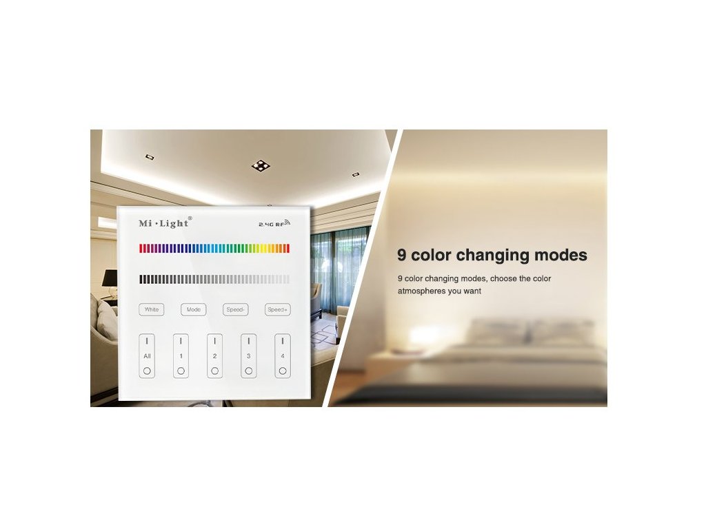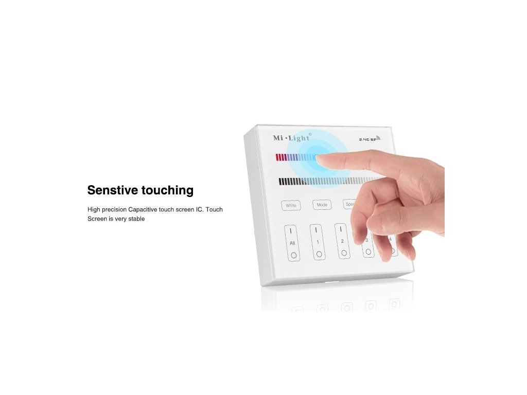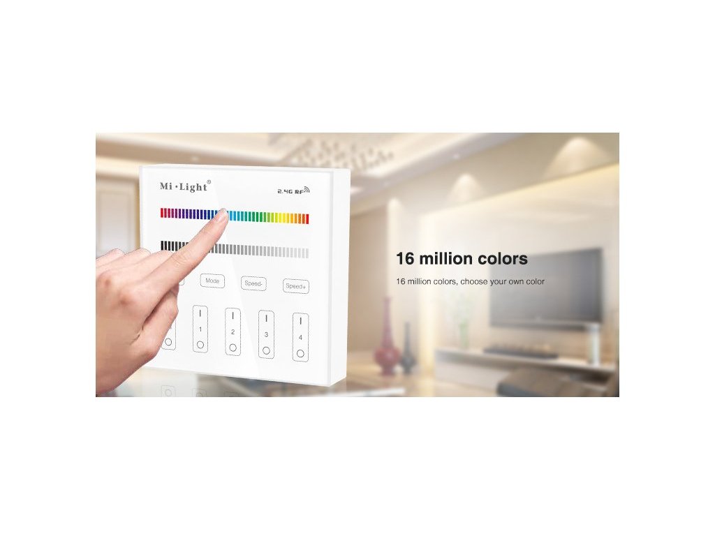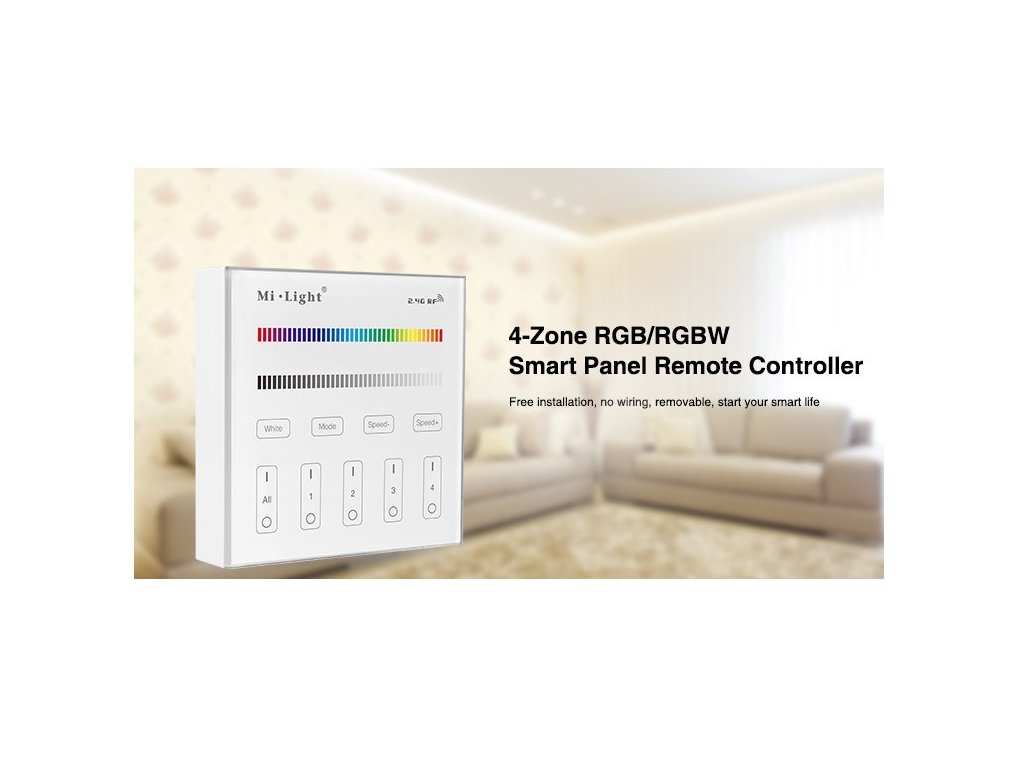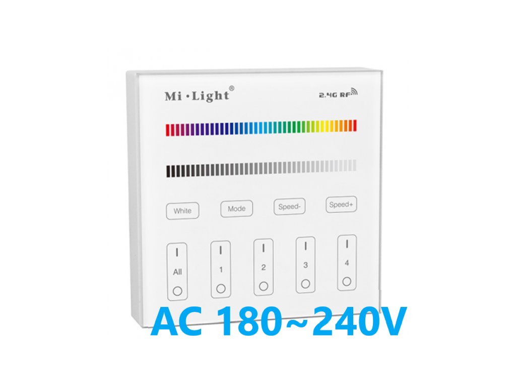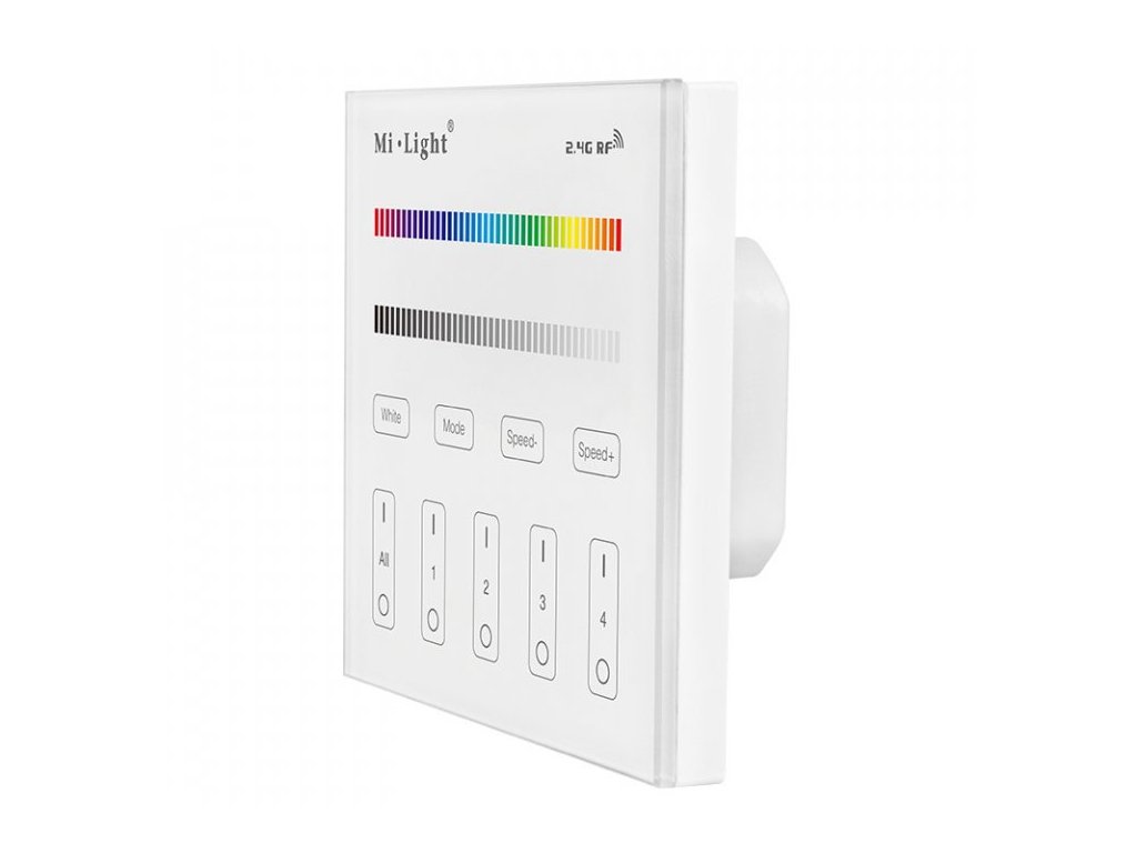 Bezdrátový nástěnný ovladač/vypínač Mi-Light T3, pro RGB a RGBW LED pásky a osvětlení, je vybaven pro ovládání čtyř samostatných okruhů či zón osvětlení. Při spojení s přijímači FUT037 nebo FUT038 lze s ním nastavit jakoukoliv barvu nebo scénu osvětlení a samozřejně i všechny okruhy zapnout a vypnout. Ovladač je vybaven dotykovým tlačítkem "DELAY OFF", což spustí funkci opožděného vypnutí se zpožděním 60sekund. Tento multifunkční ovladač také má různě přednastavené mody světelných scén s prolínáním a střídáním barev, včetně regulace rychlosti těchto programů. Ovladač by měl být umístěn do 30metrů od přijímačů, ale při použití více přijímačů po různé zóny, se vzdálenost prodlužuje o rádius třiceti metrů kolem každého přijímače. Všechny prvky jsou spolu schopny aktivně komunikovat a předávat si ovládací signál a tím se zásadně zvětší pokrytí v rámci celého domu nebo objektu.