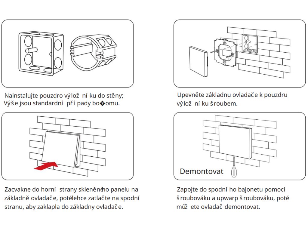 Instalace ovladače je velice jednoduchá. Ovladač se připojí dvojžilově přímo na rozvod 230V v montážní krabičce pro vypínač (L fázový + N nulový vodič). Čtcercová podsada má montážní otvory pro přišroubení na klasickou vypínačovou krabici KU68. Šroubky jsou součástí balení.