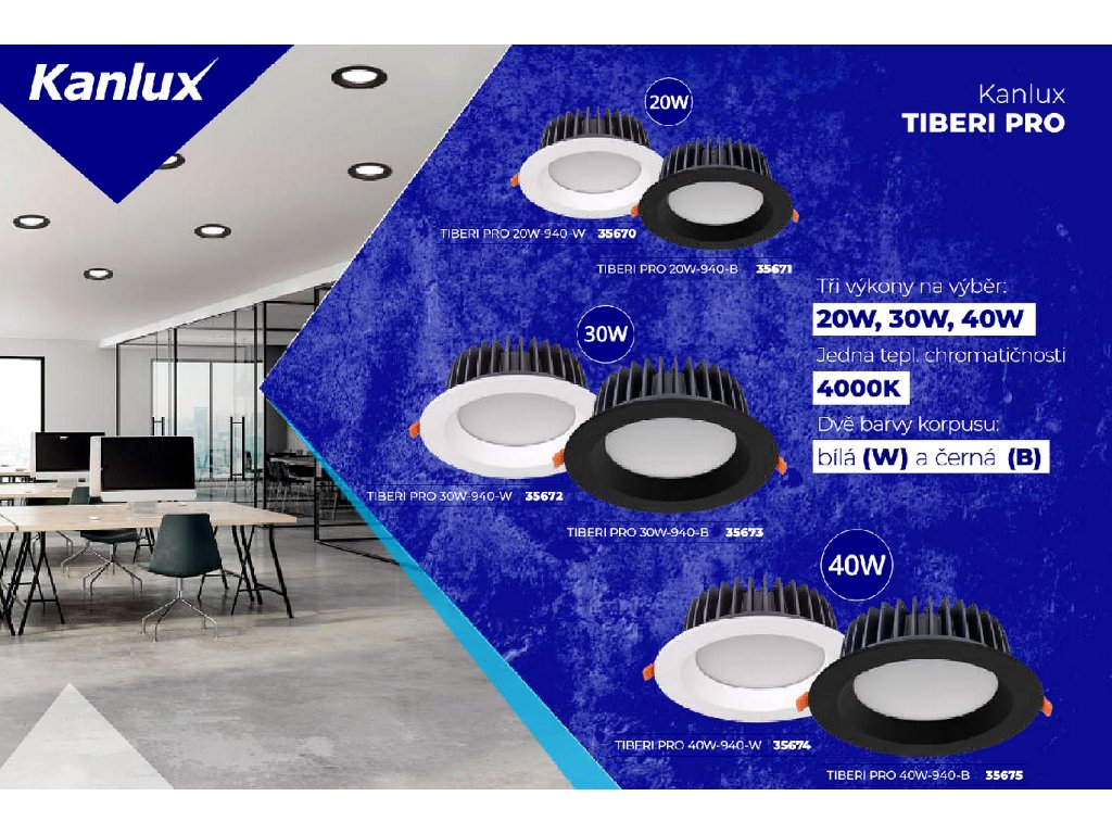 Profesionální stropní LED svítidla od firmy Kanlux, z produktové řady TIBERI PROFI, jsou tou správnou volbou pro náročné klienty, kteří vyžadují vysokou kvalitu. Úžasné světelné parametry, vysoká kvalita všech použitých komponentů a luxusní povrchové zpracování, předurčují tyto svítidla do náročných provozů s delší provozní dobou.