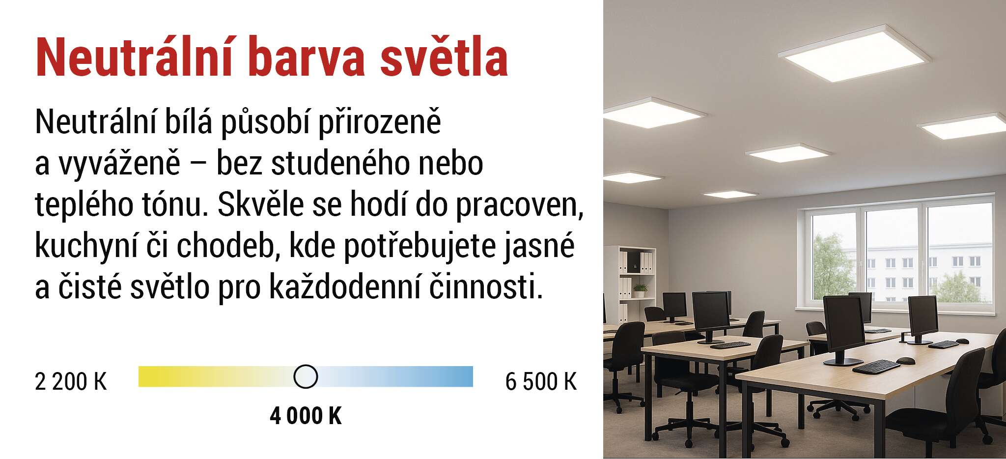 Neutrální bílá barva světla 4000 K poskytuje přirozené a jasné osvětlení bez zkreslení barev. Panel dosahuje světelné účinnosti 120 lm/W, což zajišťuje vysoký výkon při nízké spotřebě energie. Je plnohodnotnou náhradou za 4× 18W zářivky CFL, přičemž výrazně snižuje provozní náklady.