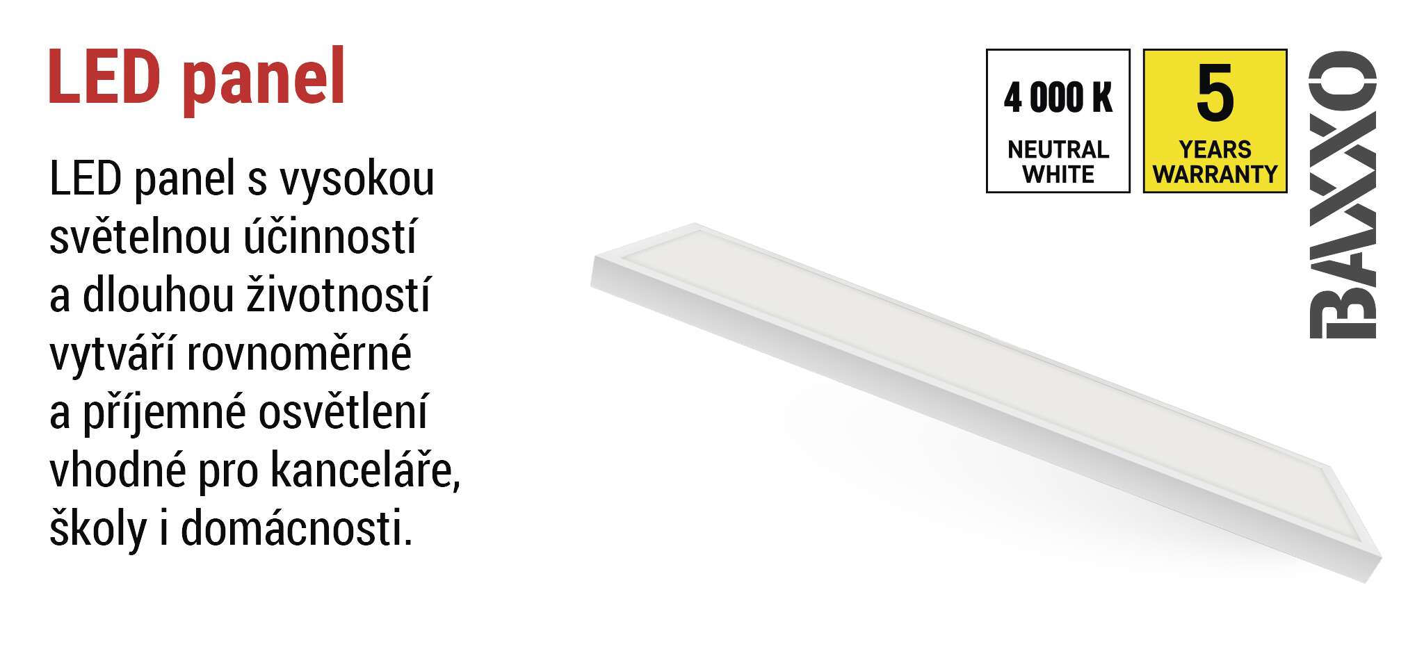 LED panely této řady dosahují světelné účinnosti až 120 lm/W, což znamená, že poskytují výrazné množství světla při minimální spotřebě energie. Díky této efektivitě jsou ideální volbou pro prostory, kde je důležité kvalitní a zároveň úsporné osvětlení. Vysoká účinnost zároveň přispívá k nižším provozním nákladům a šetrnějšímu přístupu k životnímu prostředí. Kombinace úsporného provozu, moderní technologie a spolehlivého výkonu dělá z řady BAXXO osvědčené řešení pro každodenní použití.