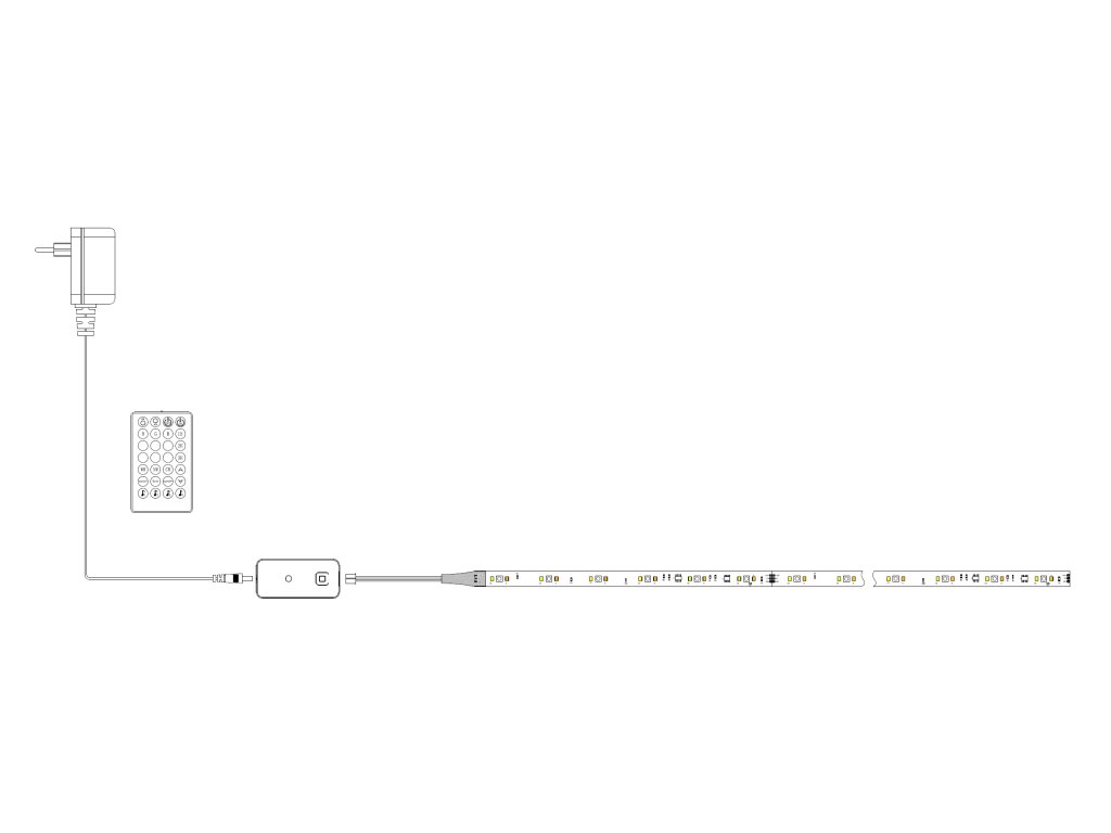 Obsah balení: LED pásek, kontroler, napájecí zdroj, dálkový ovladač, uživatelský manuál