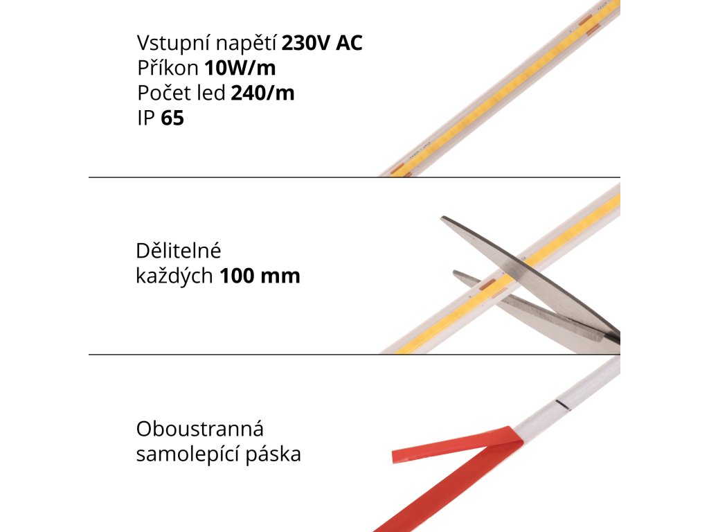 🔆 COB LED pásek HVS230COB10 – 230 V, IP65, 10 W/m 6000K studená