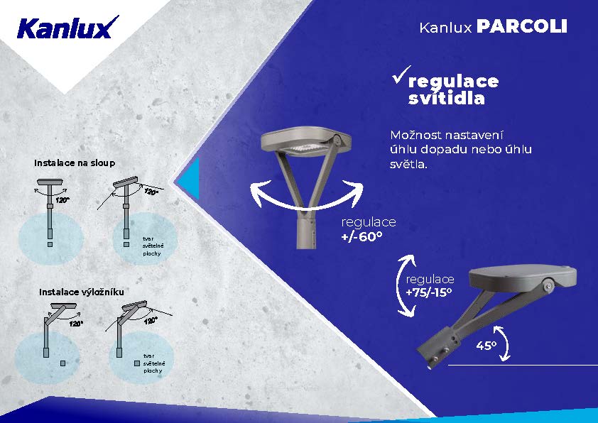 Venkovní svítidlo PARCOLI je moderní a energeticky úsporné řešení pro osvětlení parků a uliček. Nabízí nastavení výkonu (30W, 40W, 50W) a teploty barev (3000K, 4000K, 6500K), zajišťující optimální světelné podmínky. Vysoká světelná účinnost až 160 lm/W, odolnost proti povětrnostním vlivům (IP66) a možnost nastavení úhlu 60° zaručují funkčnost a životnost (IK08). Jednoduchá instalace (montáž na sloupy nebo výložníky) a certifikát ENEC potvrzují kvalitu a bezpečnost výrobku na který se vztahuje záruka 5 let.