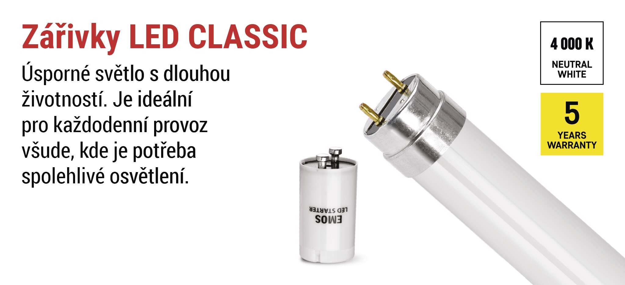 Zářivky EMOS jsou navrženy tak, aby poskytovaly dlouhodobě spolehlivé osvětlení bez kompromisů. Proto na ně poskytujeme prodlouženou záruku 5 let, která je důkazem vysoké kvality použitých materiálů i precizního zpracování. S EMOS máte jistotu, že vaše investice do úsporného LED osvětlení se skutečně vyplatí – světlo, na které se můžete spolehnout každý den, po dlouhá léta.