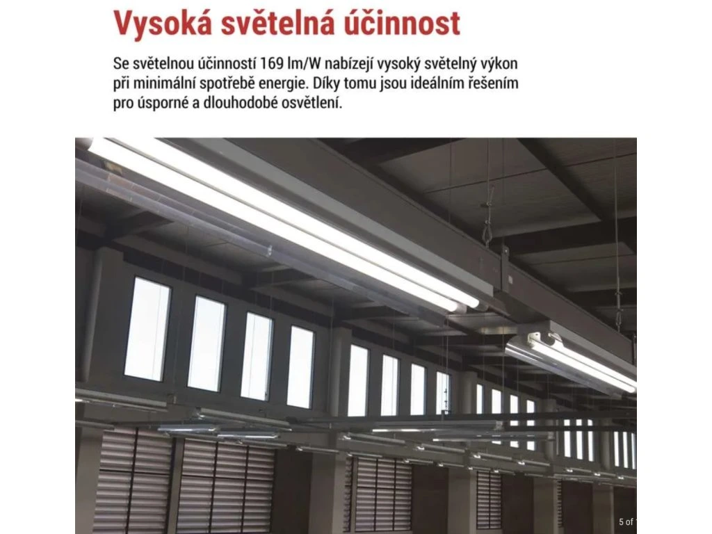 Zářivka dosahuje špičkové světelné účinnosti 169 lm/W, což znamená výrazně nižší spotřebu energie při zachování vysokého výkonu. Ideální pro prostory s dlouhou dobou svícení – sklady, výroba, kanceláře.