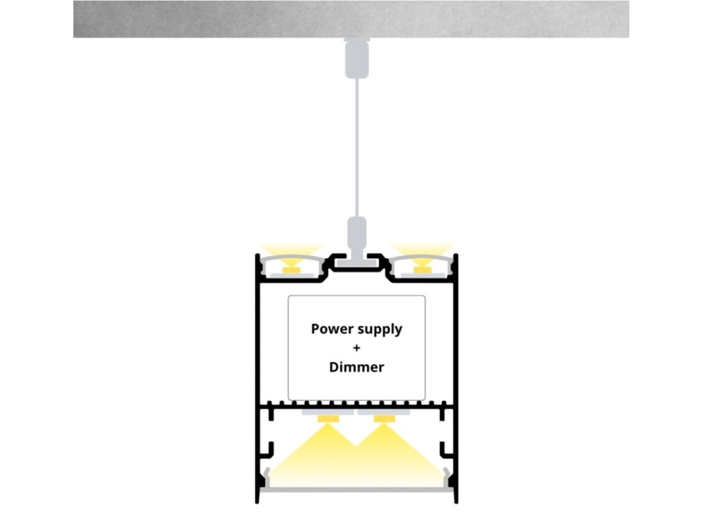 Závěsný hliníkový LED profil pro přímé i nepřímé osvětlení – prostor pro trafo i dimmer