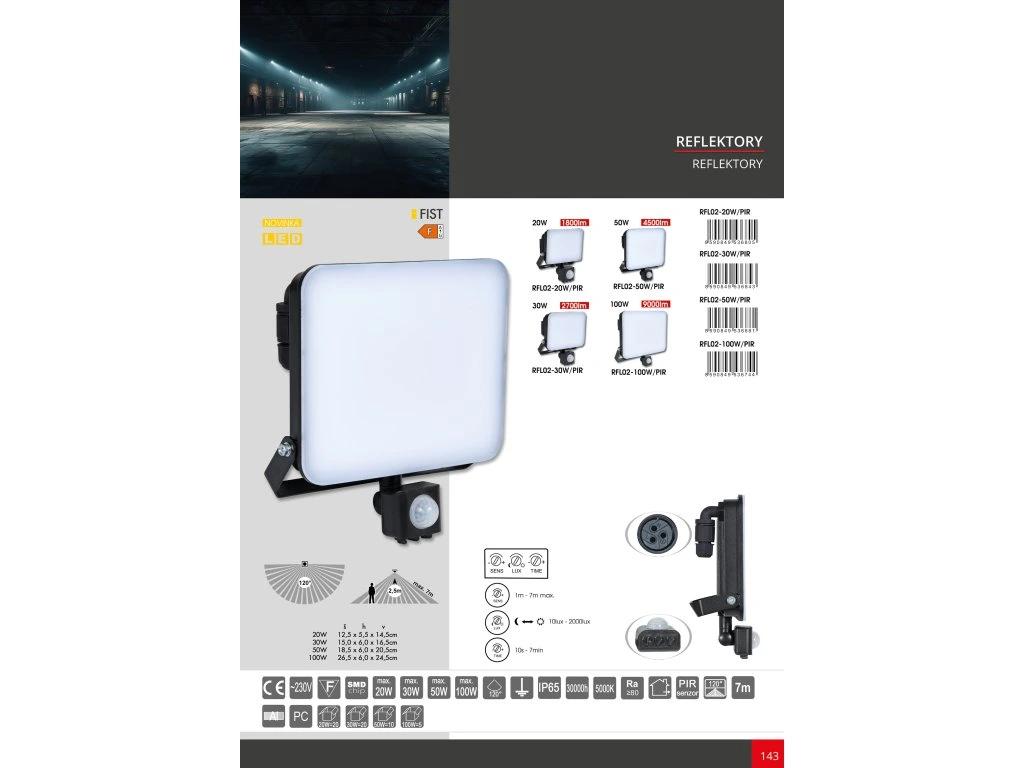 LED reflektor produktové řady FIST nahrazuje klasické halogenové reflektory, které mají často až 10x vyšší spotřebu a pomalý náběh. O úsporný chod se starají vysoce účinné a moderní čipy typu SMD. Reflektor je v hliníkovém provedení s polykarbonátovým difuzorem a díky vysokému krytí IP65 najde uplatnění i venku. Verze PIR je vybavena infračerveným čidlem pohybu, který efektivně šetří energii a funguje jen při průchodu. Citlivost a doba sepnutí senzoru je nastavitelná. Využití: např. při osvětlování budov, staveb, parkovišť, reklam, fasád, pomínků, sportovních ploch, ale i jako interiérové osvětlení výstavišť, apod.Doplňkové parametry