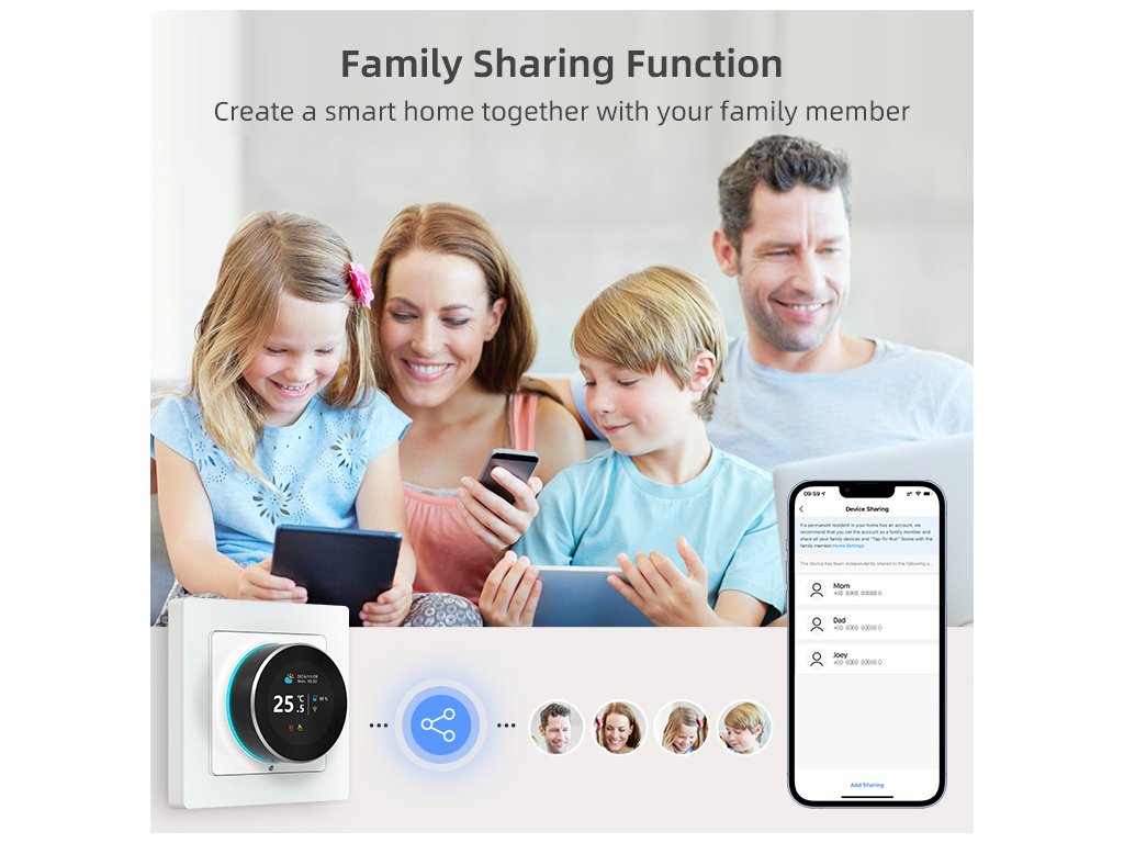 Barevný TFT displej zobrazuje nejen teplotu, ale i aktuální počasí, vlhkost, čas a stav topení. Díky integraci s chytrými asistenty Amazon Alexa a Google Home můžete ovládat topení i hlasem.