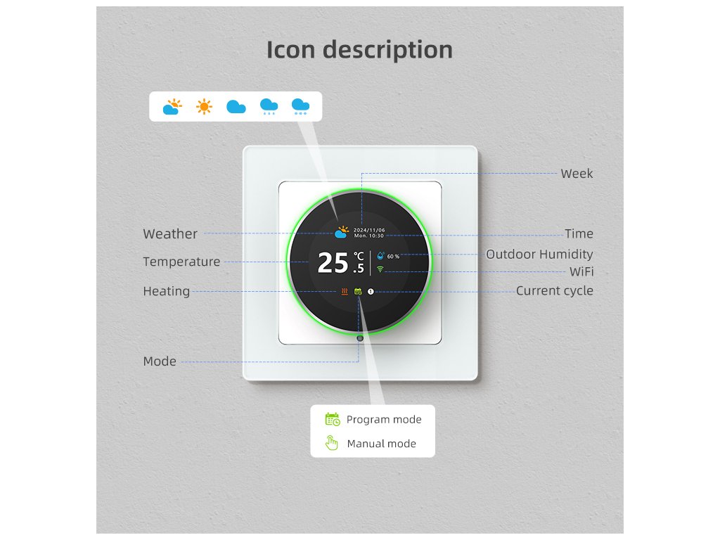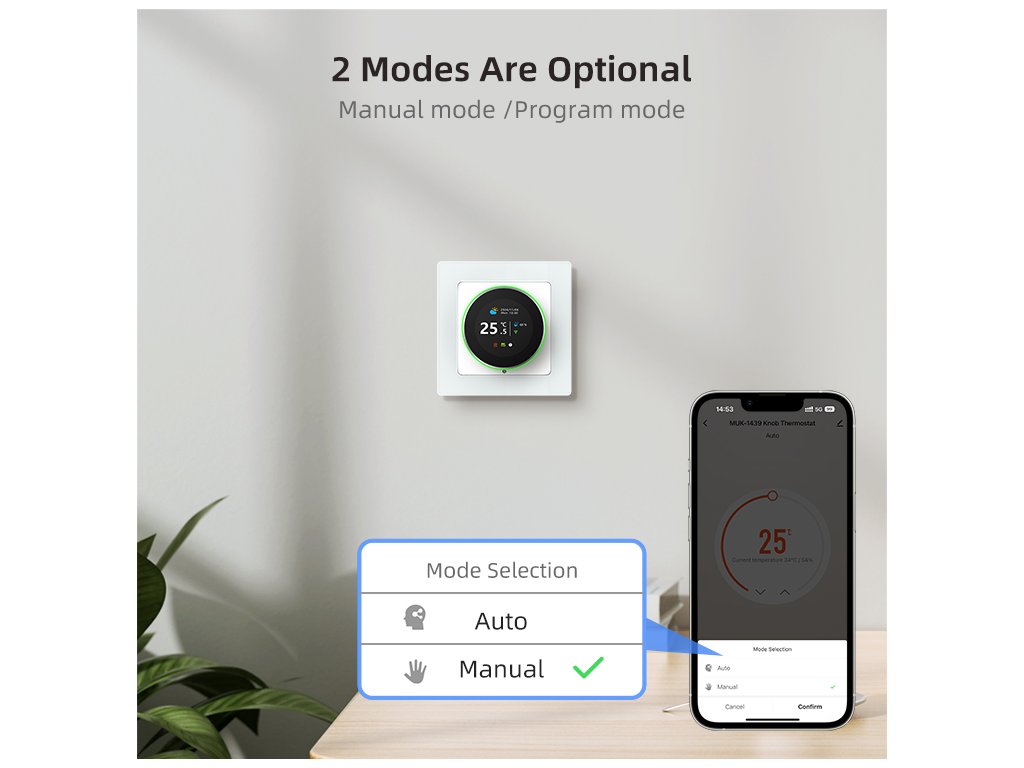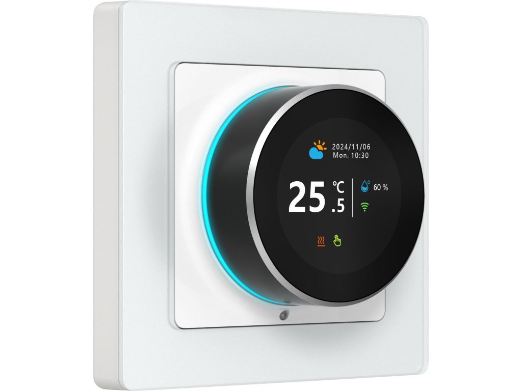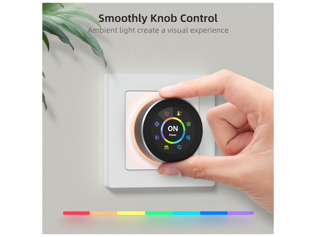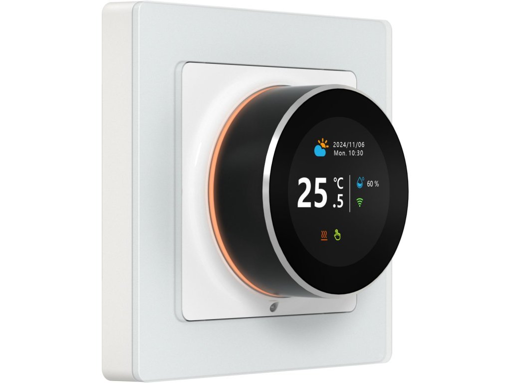Díky otočnému ovládacímu knoflíku je nastavení teploty rychlé a intuitivní. Uživatel si může zvolit ruční režim pro okamžité řízení nebo programový režim s časovými úseky podle vlastního denního režimu (5+2 / 6+1 / 7denní režim, až 6 programů denně). Termostat umožňuje také korekci teploty, nastavení hystereze i úpravu jasu displeje, který lze v noci úplně zhasnout.