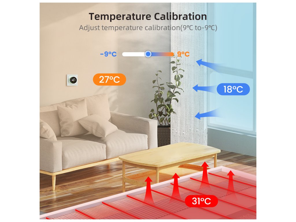 ⚙️ Přesnost ±1 °C, krok nastavení 0,5 °C, korekce −9 až +9 °C