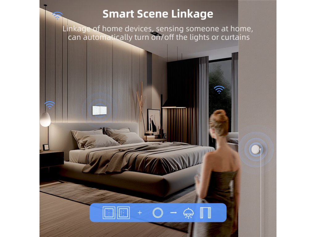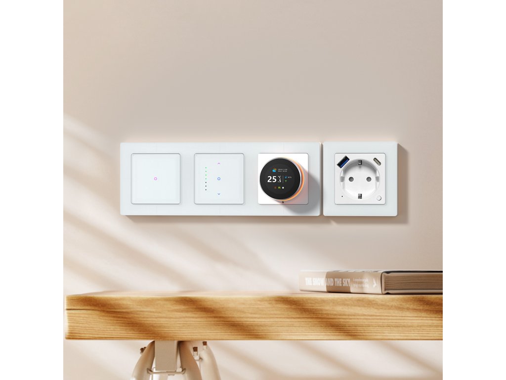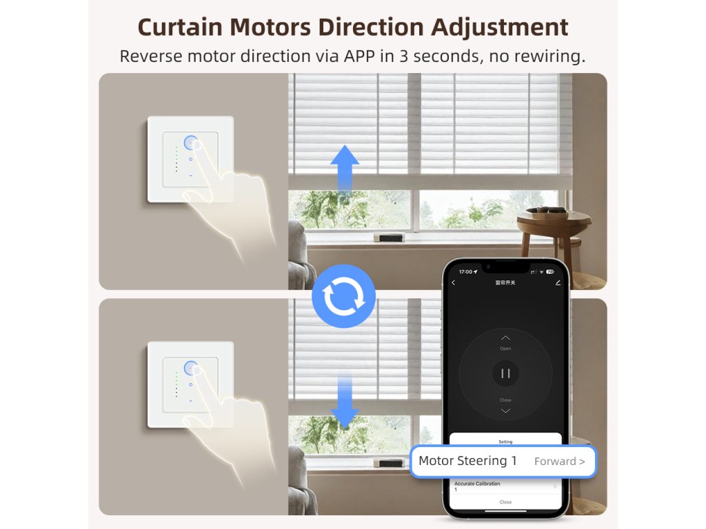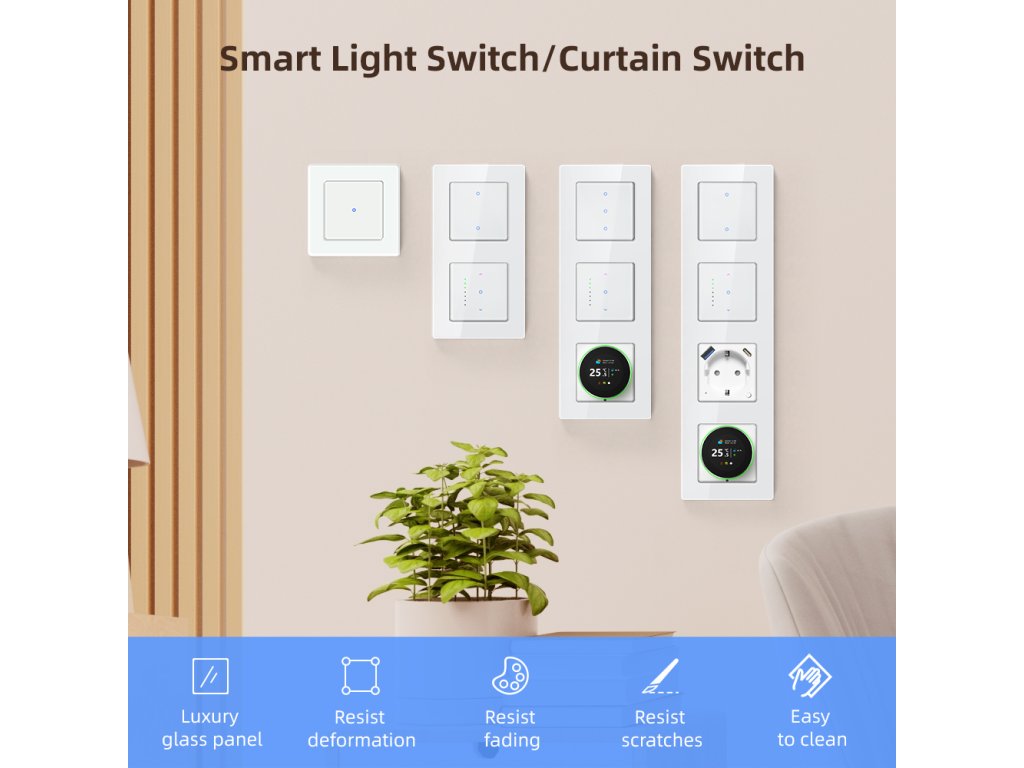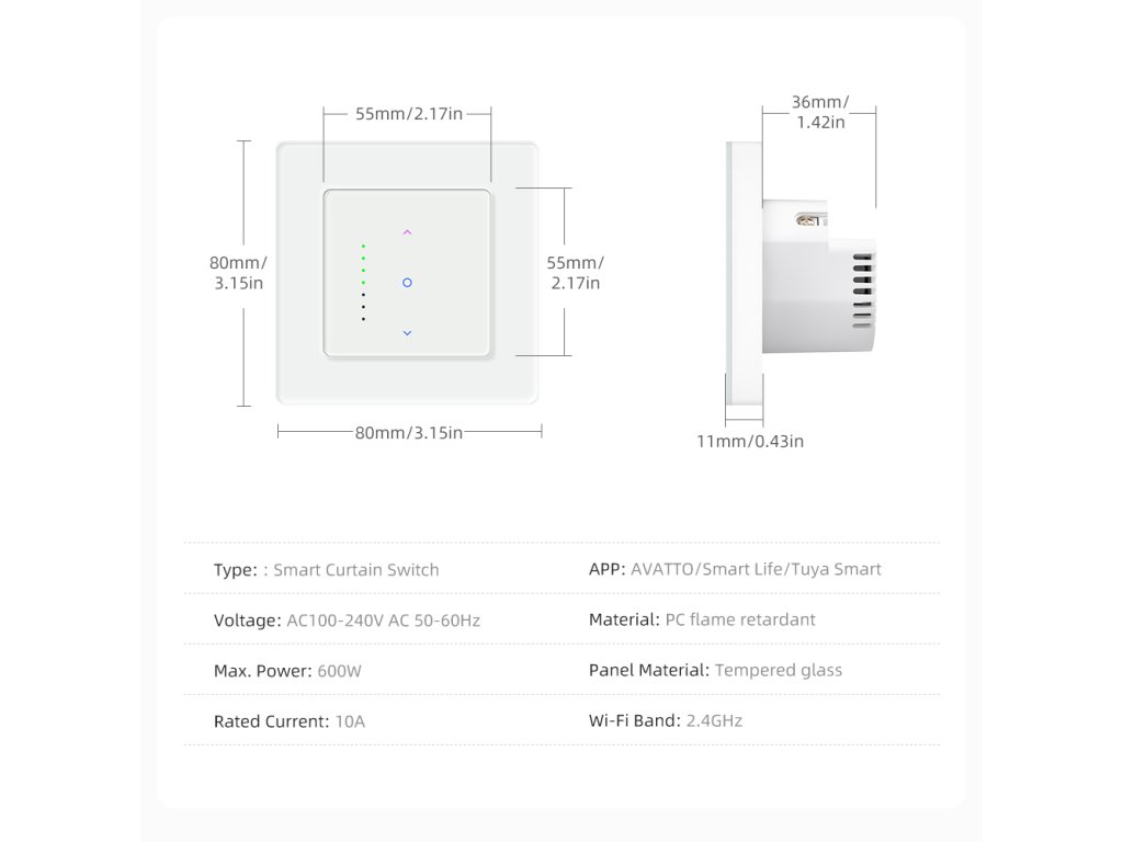 Elegantní skleněný dotykový panel s minimalistickým designem nabízí pohodlné ovládání směru nahoru / dolů / stop a hodí se do jakéhokoli interiéru. Instalace je snadná – vypínač stačí umístit do běžné elektroinstalační krabice (EU standard).