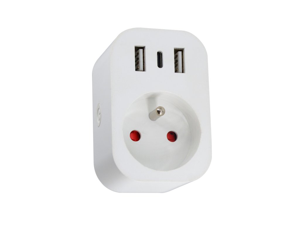 Zásuvka nabízí dva klasické USB-A porty a jeden USB-C výstup s celkovým výkonem 10,5 W, takže zvládne pohodlně napájet telefony, tablety i menší elektroniku.
