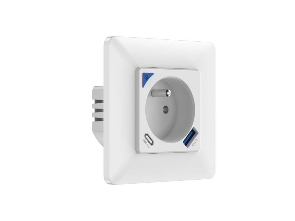 Zásuvka je vybavena 1× USB-A a 1× USB-C portem s maximálním kombinovaným výkonem 3,4 A / 20 W.