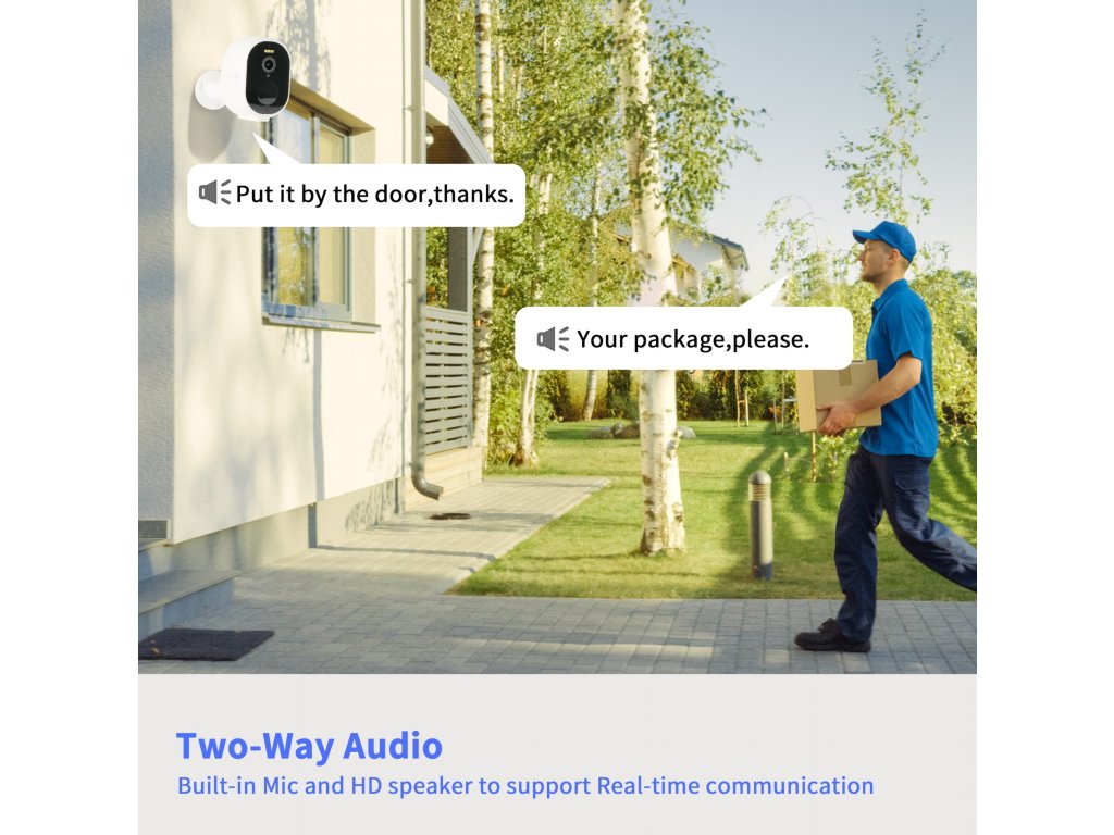 Vestavěný PIR senzor s úhlem 120° a dosahem 4–6 m rozpozná pohyb osob nebo zvířat a okamžitě spustí alarm a notifikaci na vašem telefonu. Kromě detekce pohybu umožňuje kamera také obousměrnou komunikaci díky mikrofonu a reproduktoru – ideální pro rozhovor s návštěvníkem, doručovatelem nebo rodinou.