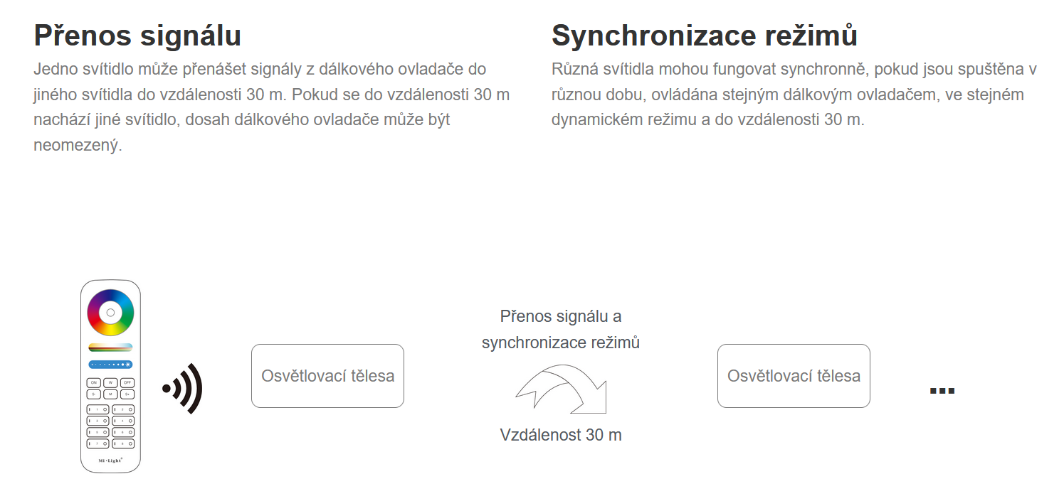Až 30 m, s přenosem signálu mezi svítidly prakticky neomezený.