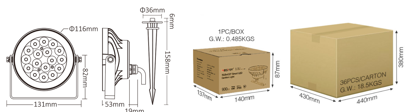 Zahradní zapichovací reflektor Mi-Light 9w RGB a CCT FUTC02, je vhodný pro pocitové osvětlení vaších zadrad, balkónů nebo teras. Jednoduchá instalace zapíchnutím bodce do země nebo květináče. Úzký úhel svitu, pouhých 15°. Možnost nastavení barevných scén, podkresů, prolínání nebo střídání barev.